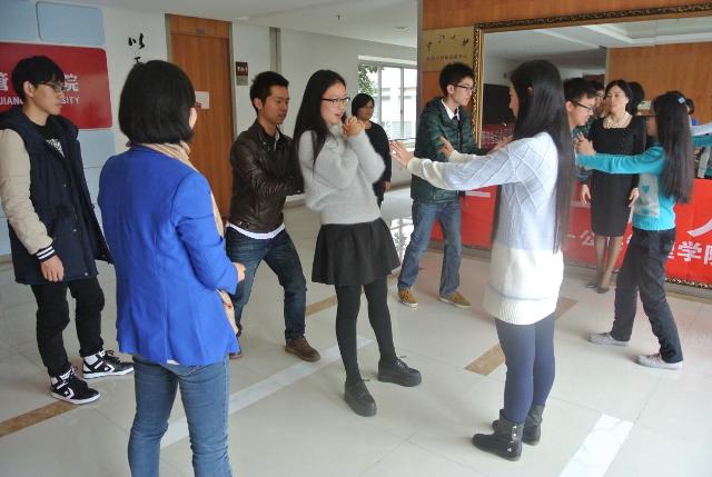 随后,主讲老师带领大家到室外进行了“信任倒”游戏作为热身。从“二人倒”到“三人倒”再到“风中柳”,情侣们通过这一热身活动,对人与人交往过程中必须具备的信任和责任感有了更为直观和深刻的感受,大家的心情也因而逐渐放松,更好地适应了活动氛围。包老师也由此提出工作坊的主要目的即在于提升同学们的自我觉察力,让同学们在活动的过程中去体会内心最真实的感受。